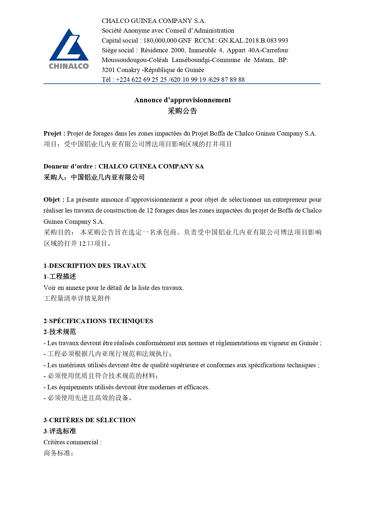 Appels d'offres Annonce d’approvisionnement pour la sélection d’un entrepreneur pour réaliser les travaux de construction de 12 forages dans les zones impactées du projet de Boffa de Chalco Guinea Company S.A. 2 janvier 20262 janvier 2026 Télécharger l’avis complet en PDF: DAO-YXQ1230