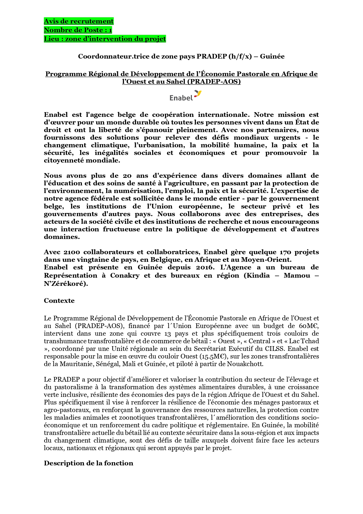- Lieu d’affectation et mobilité : Le poste sera basé dans l’une des zones d’intervention du projet en Guinée, avec possibilité d’ajustement du lieu d’affectation en cours de
