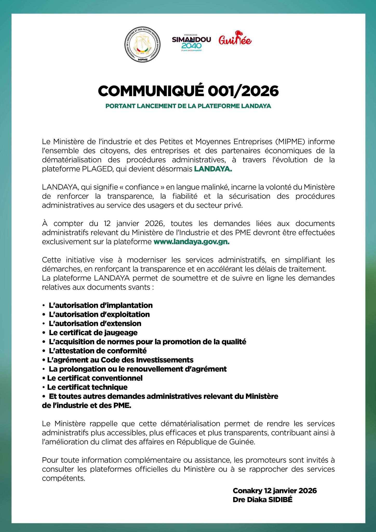 Dans le souci de lutter contre la lourdeur administrative dans le traitement des dossiers, le gouvernement guinéen à travers le ministère en charge de l’Industrie et des Petites et Moyennes a mis en place la plateforme numérique Landaya. Cette initiative vise à moderniser les services administratifs en simplifiant les démarches.